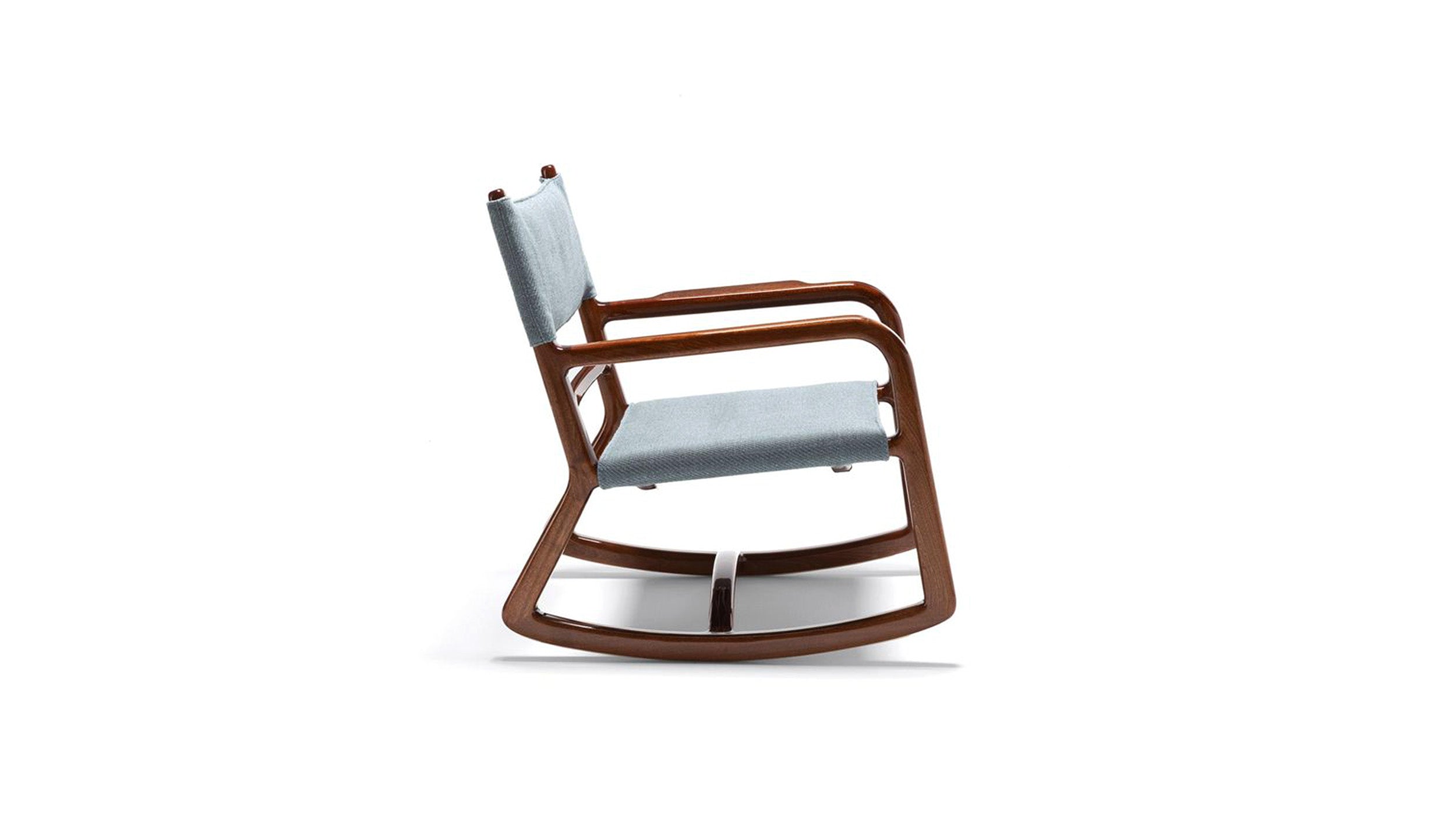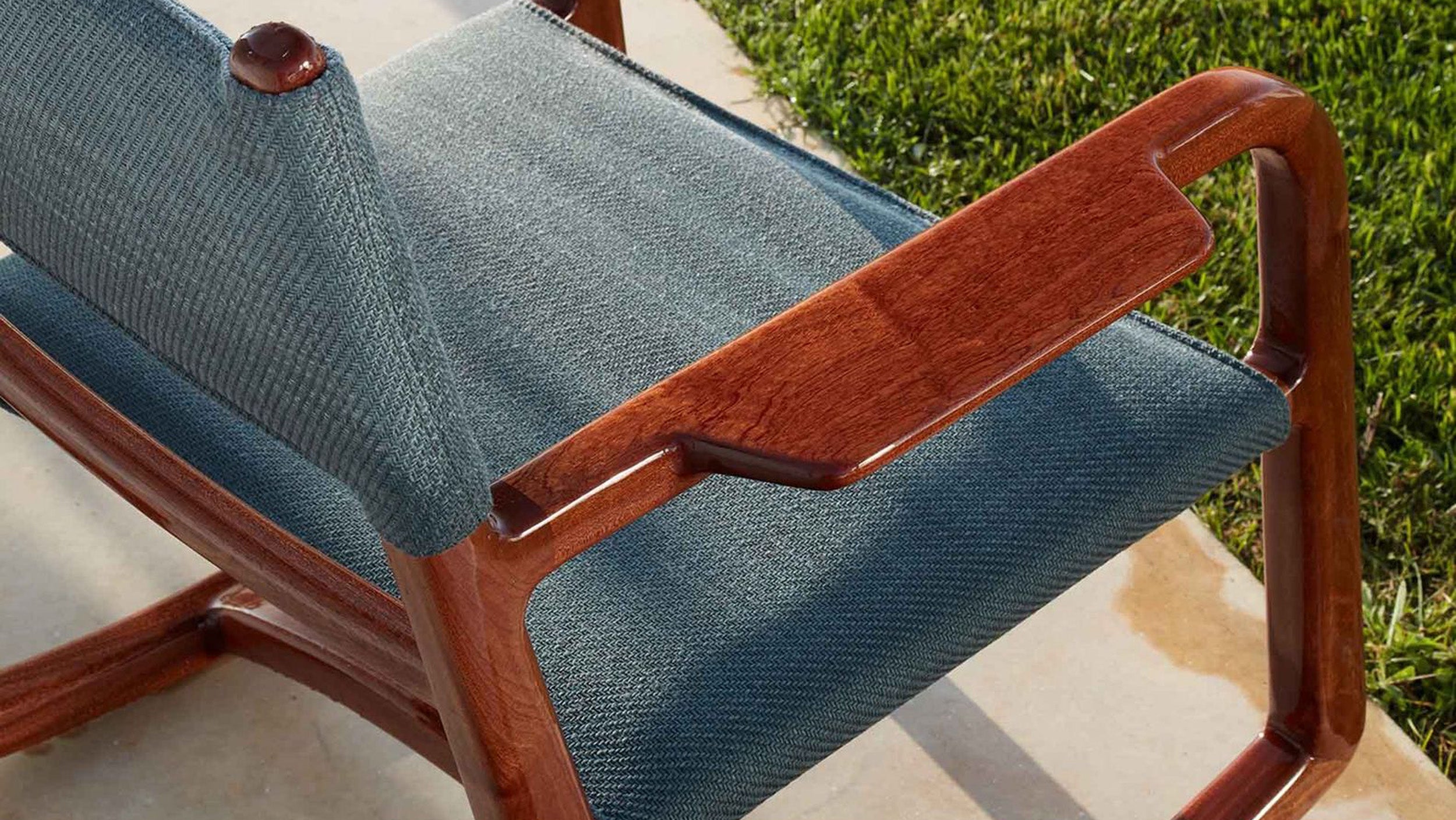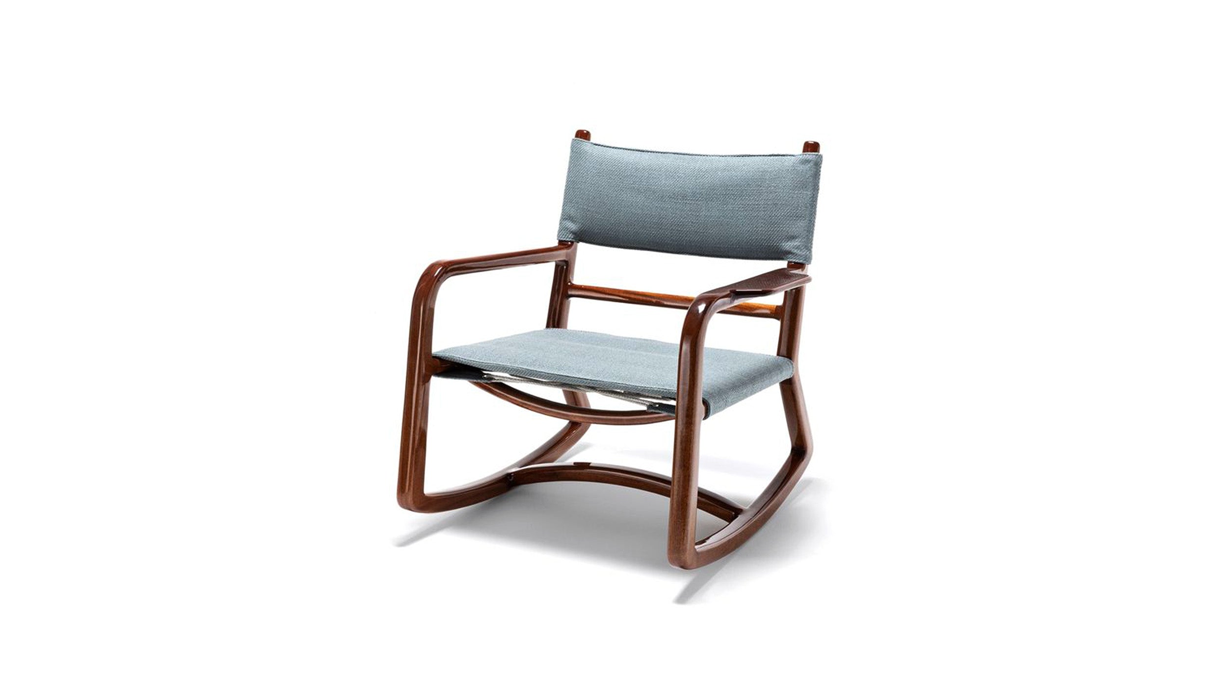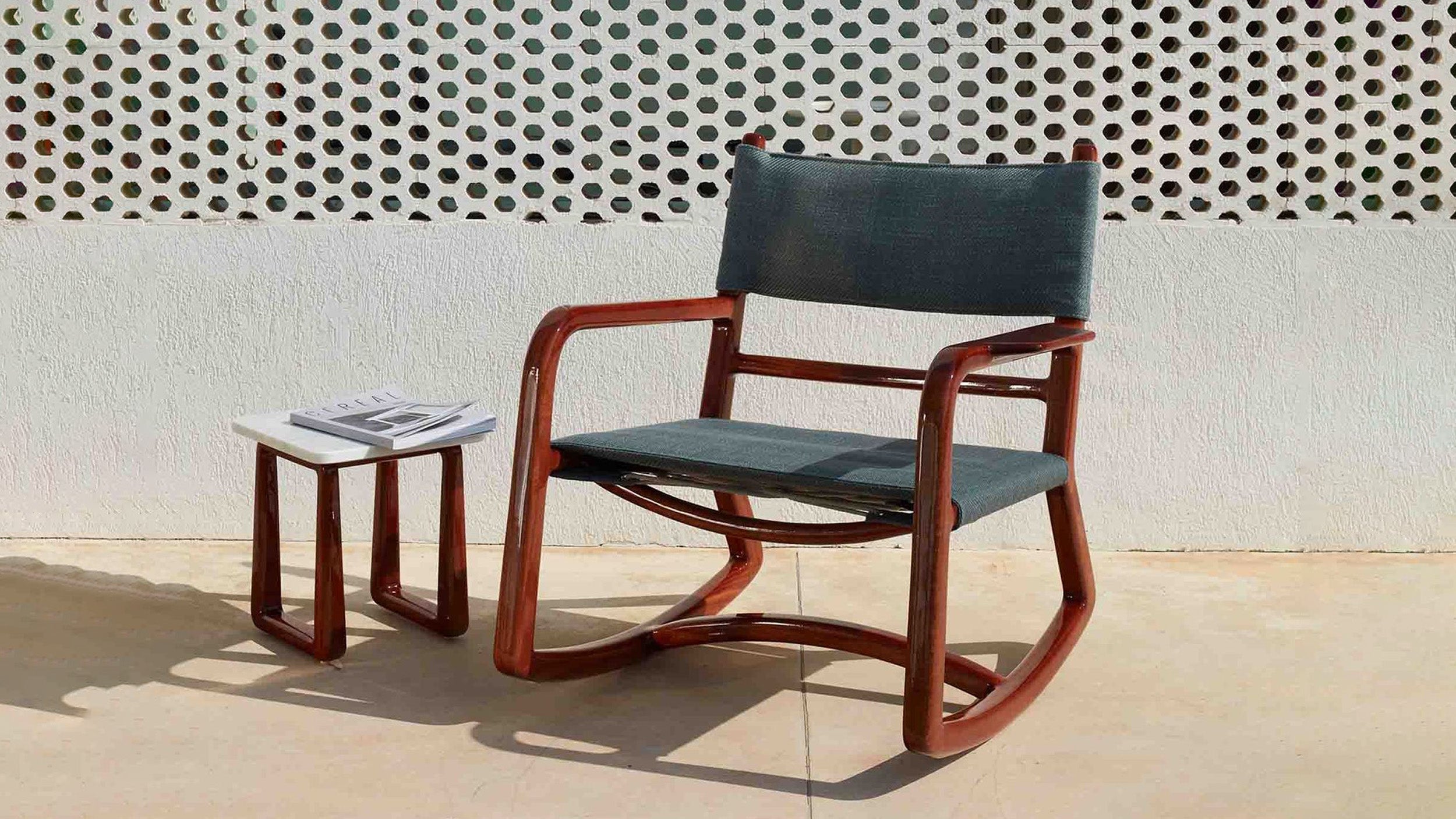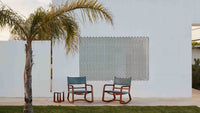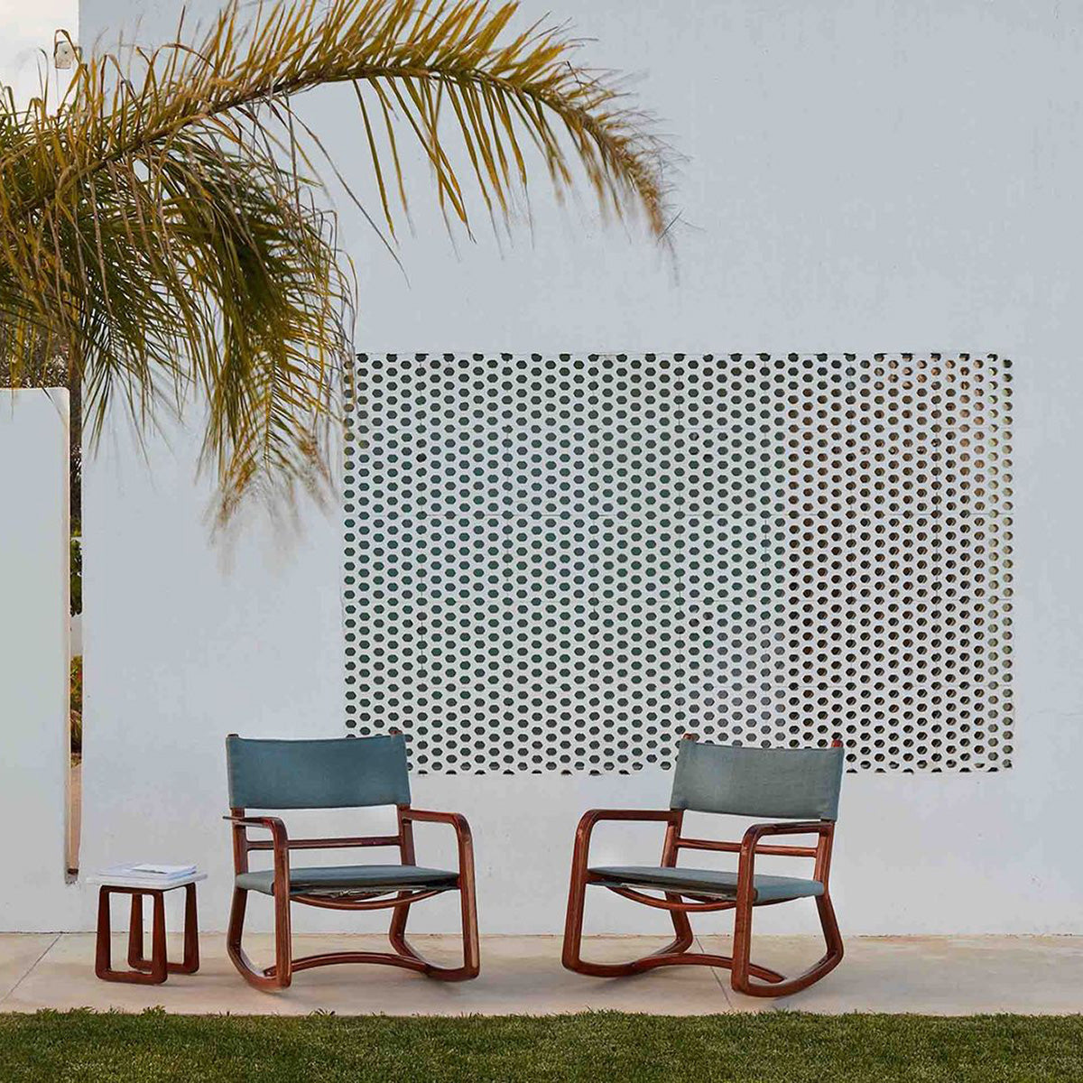 The LPIDC05 Rocking Chair, designed by Paola Navone for Exteta with Loro Piana Interiors, introduces rhythm into outdoor comfort. Its curved runners and generous seat encourage slow movement and reflective pause. Crafted in the same language of wood and fabric, it brings a poetic calm to verandas, decks, and shaded patios.