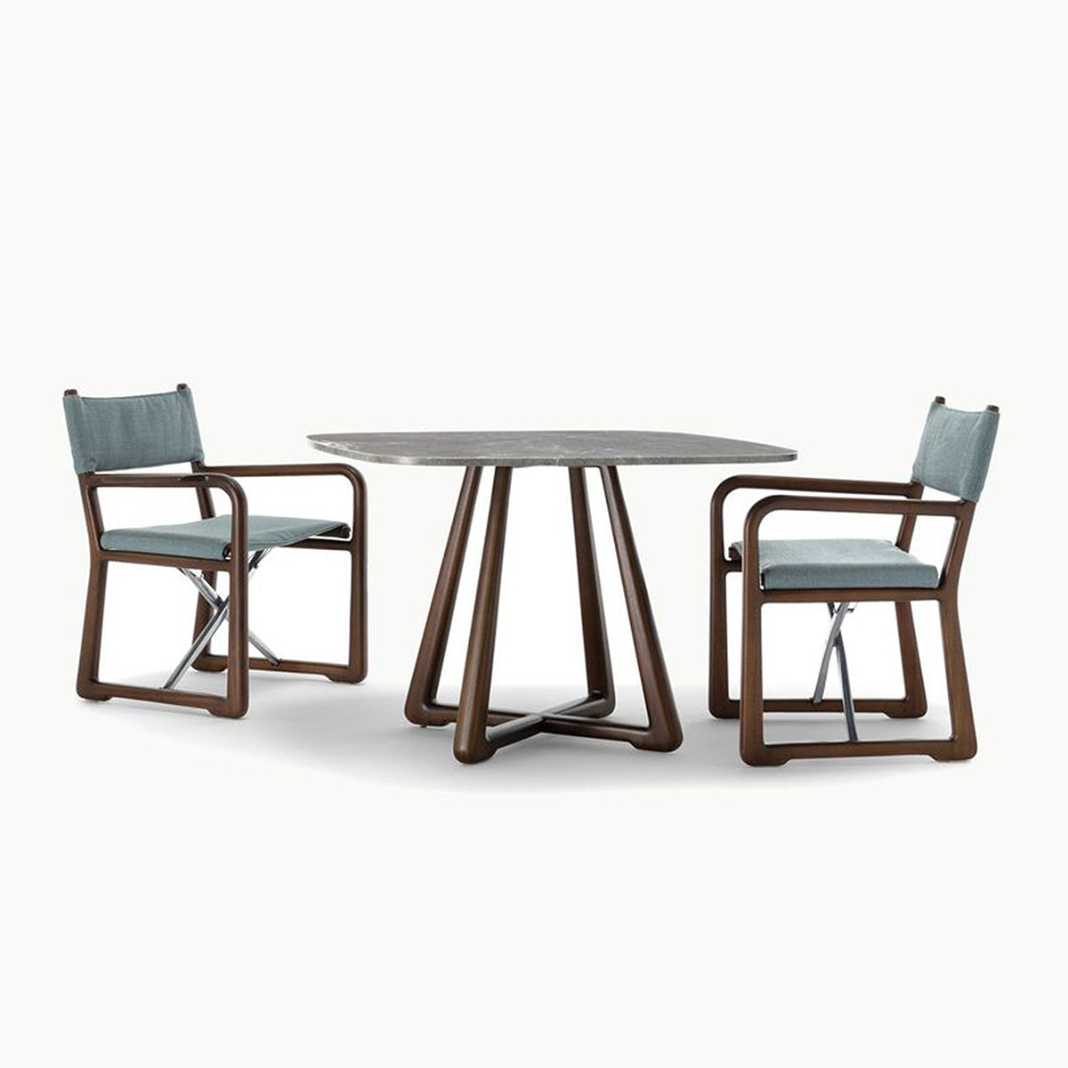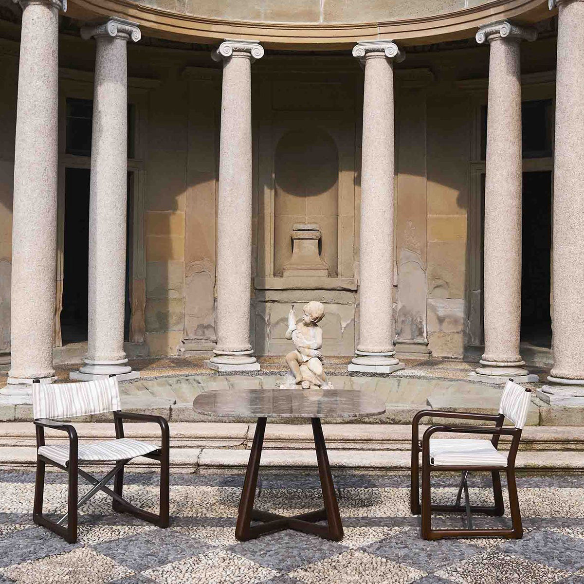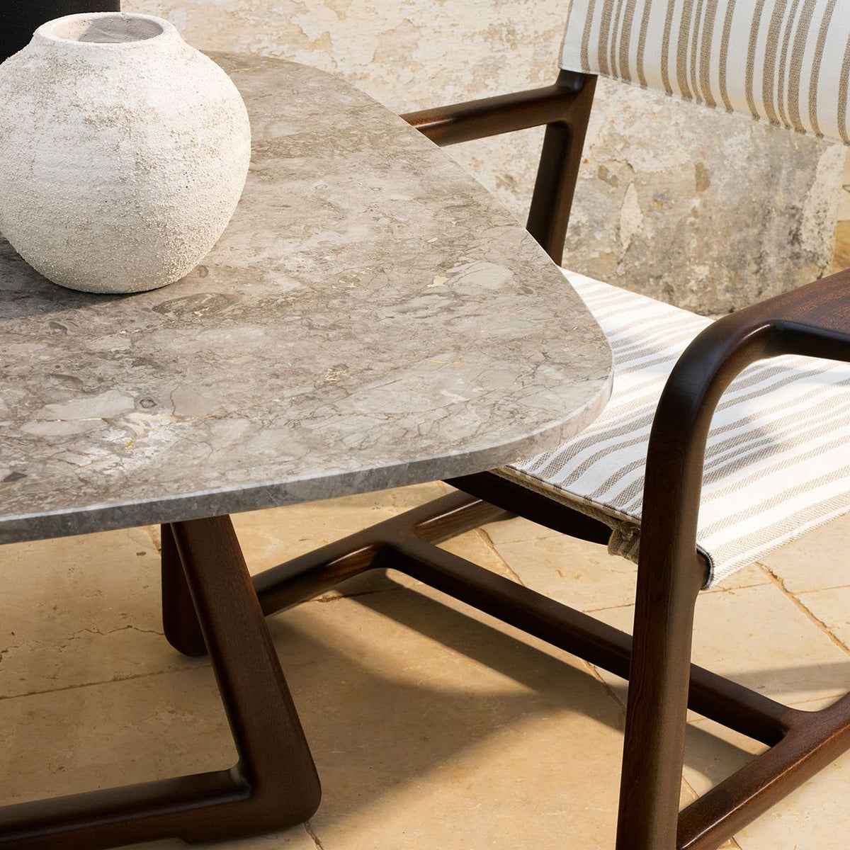 The LPIDC06 Table anchors the collection with structural clarity. Designed by Paola Navone for Exteta and Loro Piana Interiors, its sapelli wood surface can be paired with marble for an elevated touch. Balanced proportions and quiet elegance allow it to complement the full suite of Delight seating without overpowering the composition.