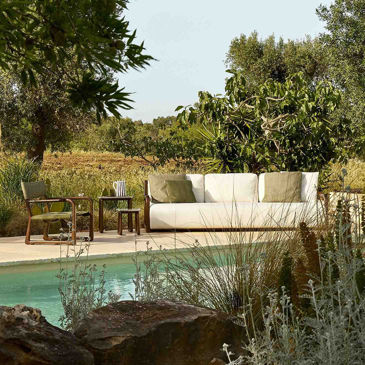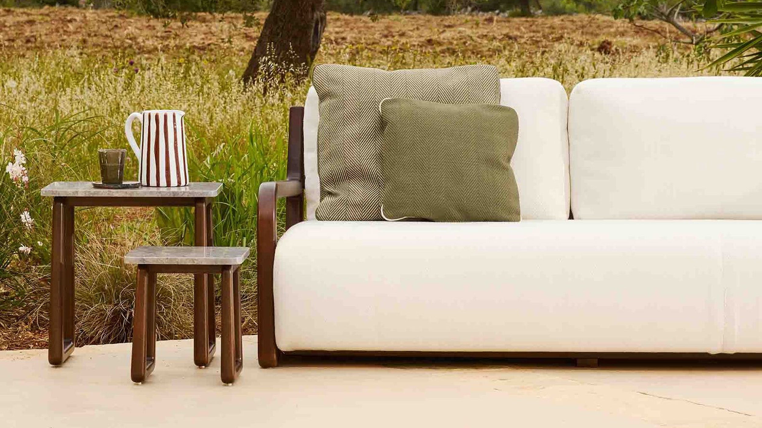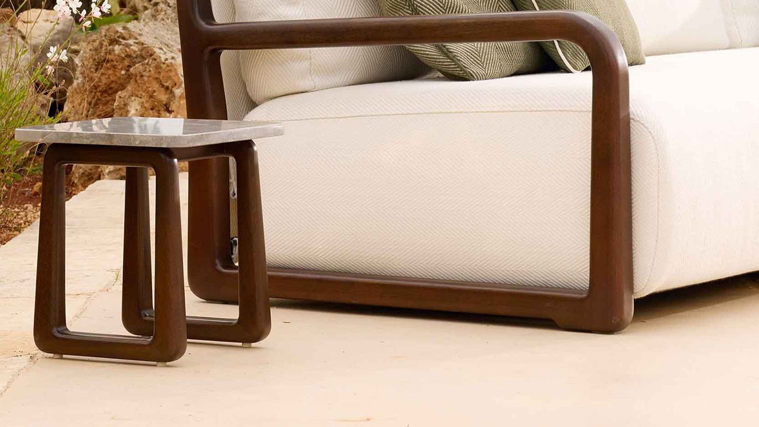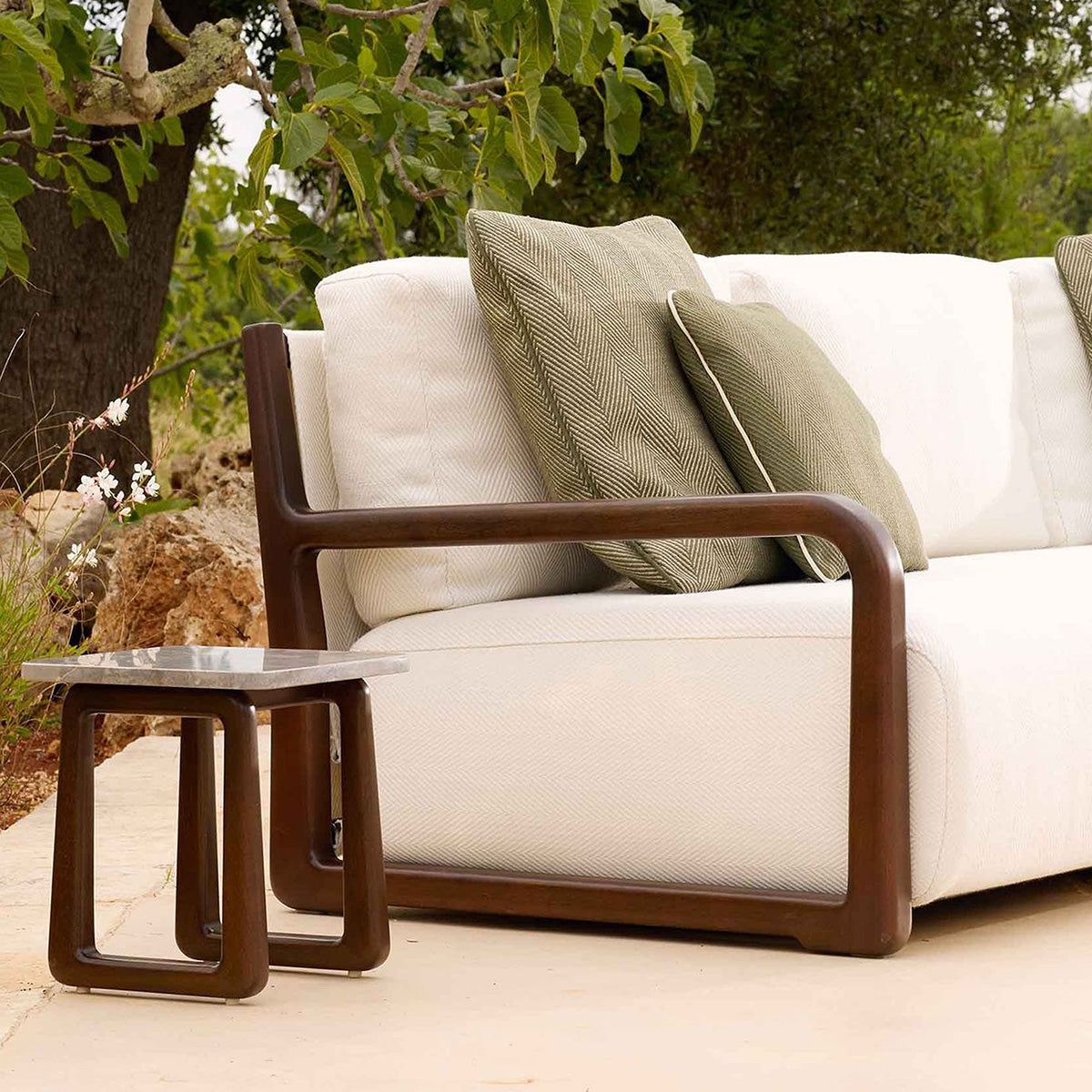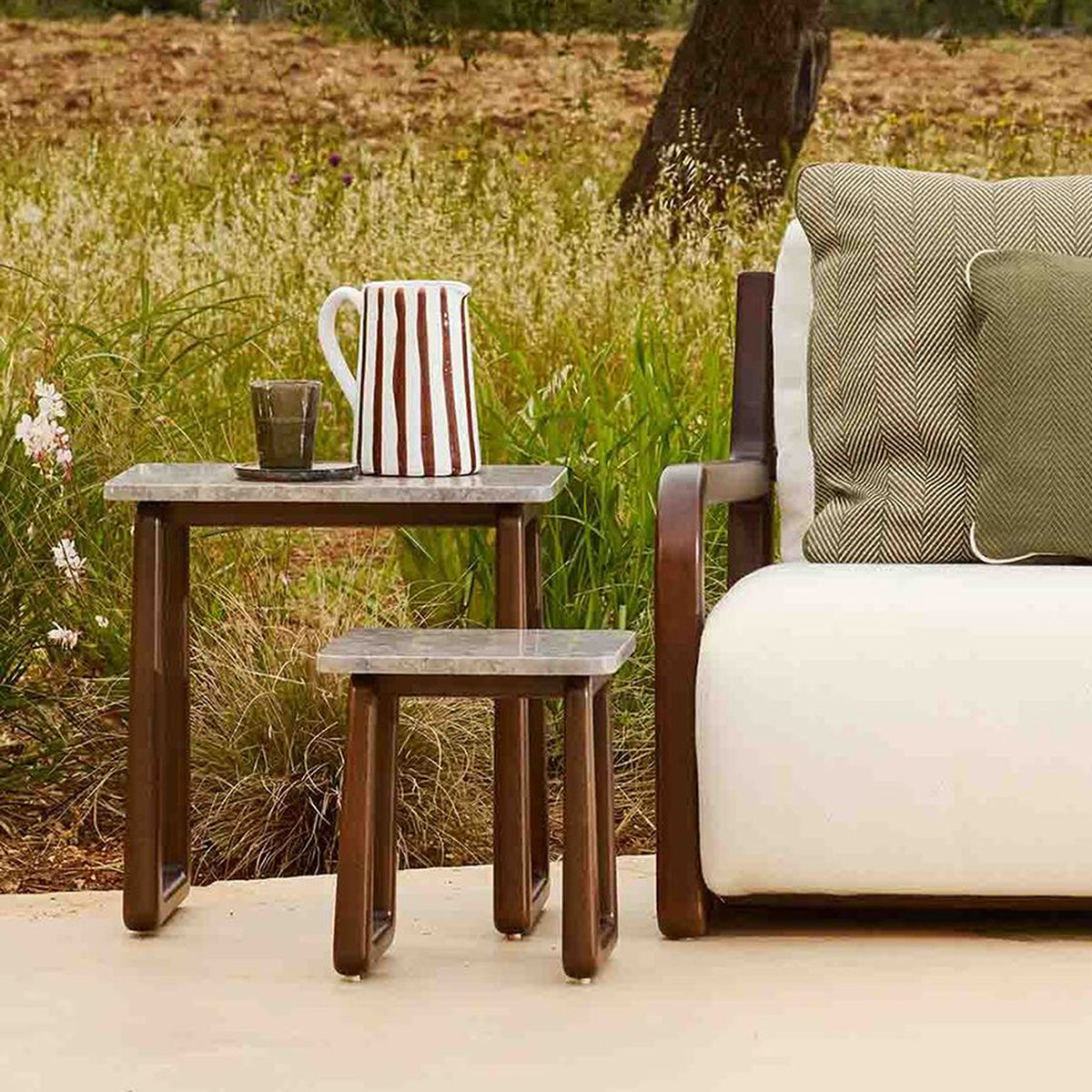 The LPIDC07 Side Tables provide subtle support wherever needed. Paola Navone designed them for Exteta with Loro Piana Interiors as companions to loungers and sofas, crafted in the same noble wood and finishes. Their discreet size and elegant detailing make them indispensable accents for curated outdoor living.