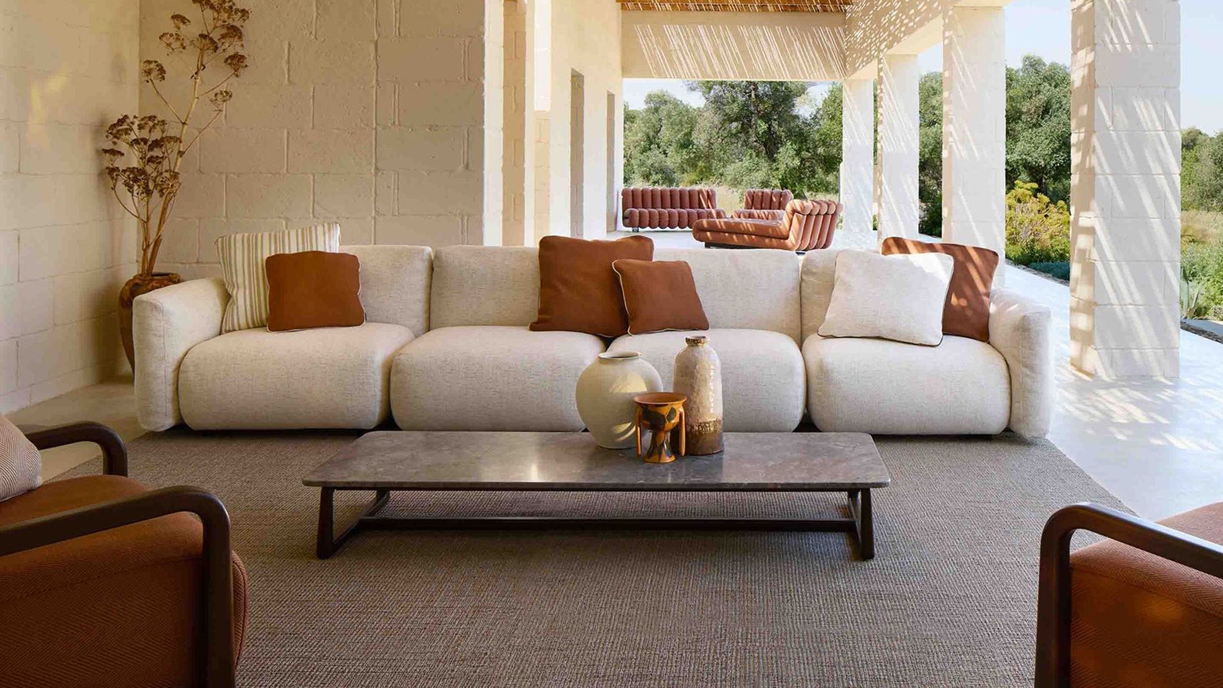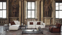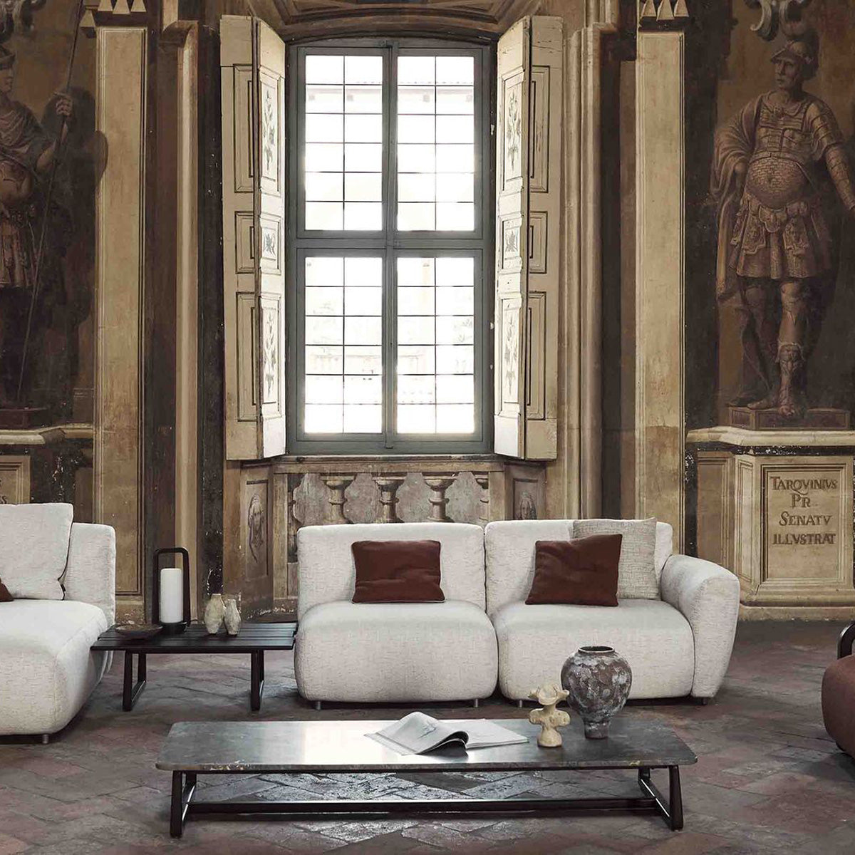 The LPIDC10 Coffee Table & Pouf, designed by Paola Navone for Exteta and Loro Piana Interiors, highlights duality. Used as a cushioned pouf or topped for a coffee table, it demonstrates the collectionÕs adaptability. This hybrid piece brings playful flexibility without losing the collectionÕs understated refinement.