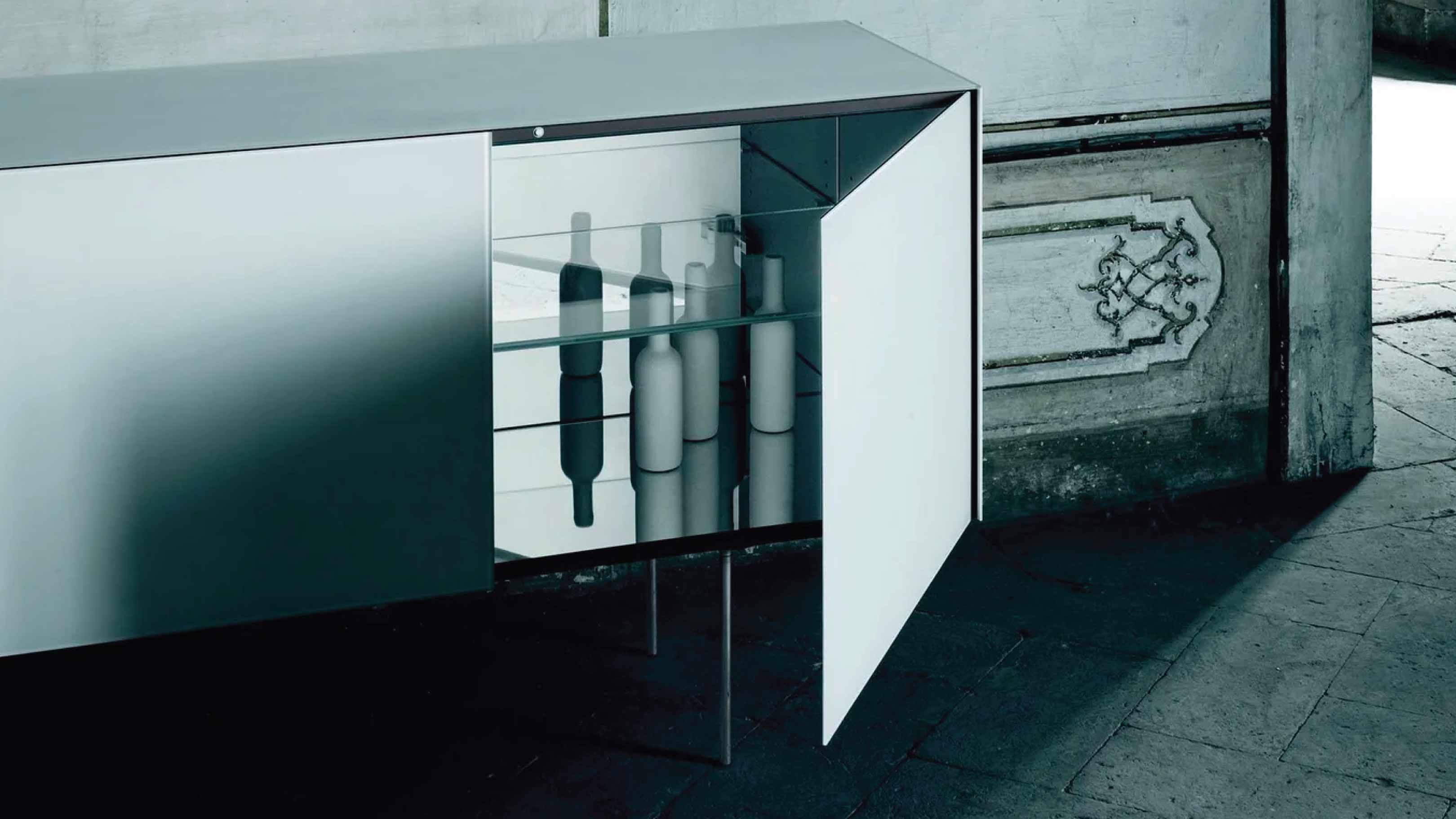 Magic Box, разработанный Пьеро Лиссони для Glas Italia, — это впечатляющий буфет, сочетающий в себе практичность и стиль. Шкаф изготовлен из закалённого стекла, элегантно склеенного под углом 45°, и доступен как в глянцевом, так и в матовом лакированном исполнении.