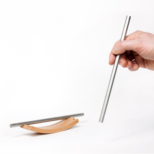 - A clever salt and pepper shaker set consisting of two tubular shakers and wood rest